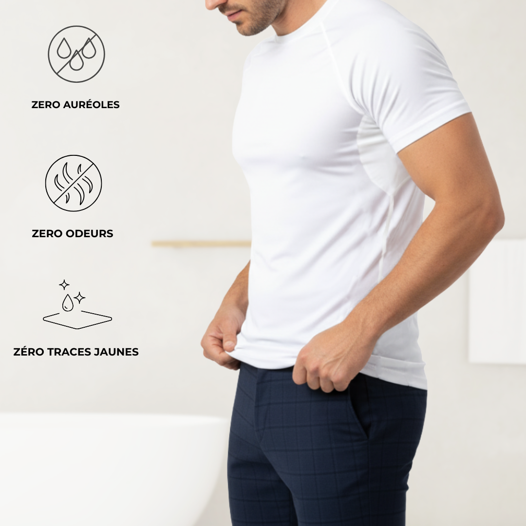 Ce t-shirt anti-transpiration a été pensé pour ceux qui bougent, transpirent, avancent — mais qui veulent rester présentables, confiants et à l’aise en toutes circonstances.
