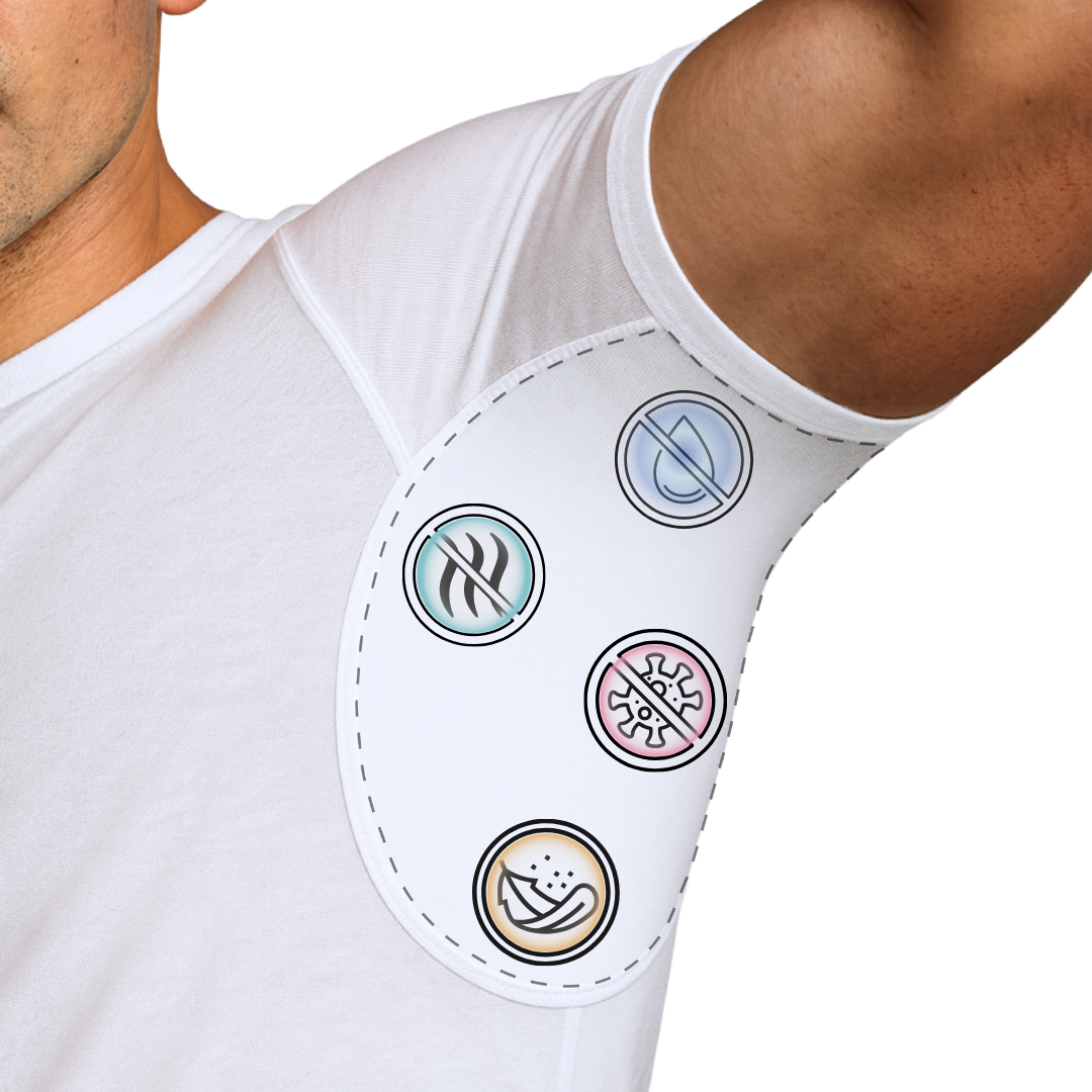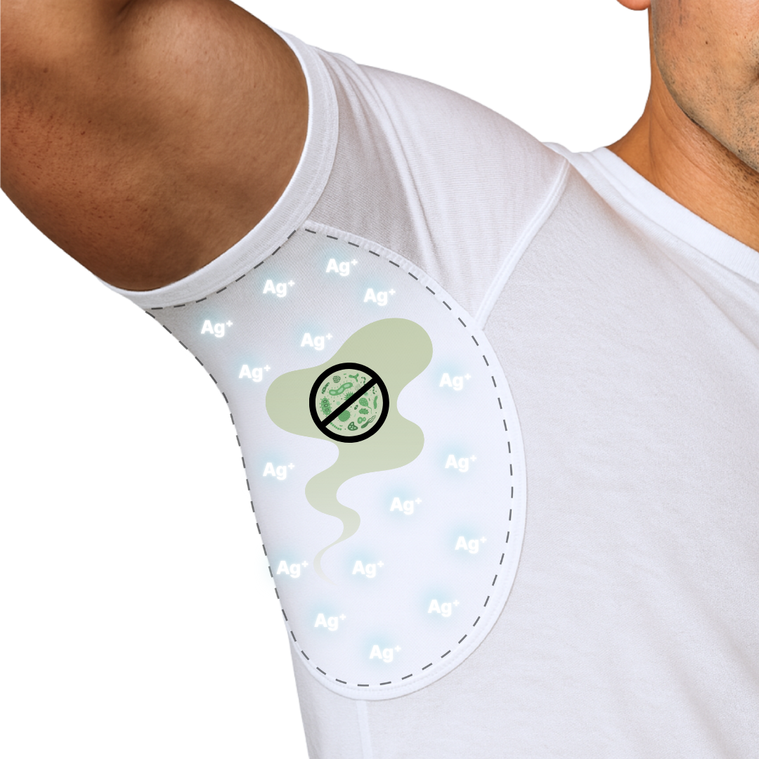 Notre textile intègre au niveau des aisselles un traitement intelligent à base d’ions d’argent, conçu pour neutraliser les bactéries responsables des mauvaises odeurs. Fixé durablement dans la fibre, ce procédé permet de limiter la formation d’odeurs et de garder une sensation de fraîcheur plus longtemps, sans affecter le confort ni l’aspect du tissu. Certifié sans danger pour la peau, même sensible, il reste efficace lavage après lavage.